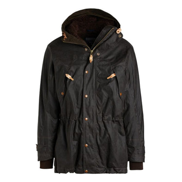 Vorderöffnung mit doppeltem Reißverschluss und winddichter Knopfleiste mit Druckknöpfen, zwei großen externen Handwärmtaschen mit Reißverschluss und Klappe mit Druckknopf, eine Innentasche mit Reißverschluss, Ärmel mit elastischen Manschetten, Kapuze, verstellbare Taille und Unterseite mit elastischem Kordelzug. Alle Lederaccessoires sind aus natürlichem pflanzlich gefärbtem Leder. Die Long Mountain Jacket ist wie die klassische Mountain Jacket, aber um 6 Zoll länger, aus wasserabweisender Paraffinbaumwolle. Die Jacke hat zwei große Vordertaschen mit Reißverschluss, elastische Bündchen an den Ärmeln, durch die keine Luft eindringen kann, und einen doppelten Kordelzug, eine in der Taille und eine am Boden, damit das Kleidungsstück perfekt am Körper haften kann. An den Handgelenken befinden sich zwei Einstellfrösche mit Doppelknopf. Ein vorderer Reißverschluss mit Doppelschieber, der von einer Sturmklappe mit Druckknöpfen gekrönt wird, schließt das Kleidungsstück. Jeder Knopf hat verstärkte Lederscheiben. Die Kapuze hat zwei Kordeln, eine auf der Vorderseite, die perfekt am Gesicht haftet, und eine auf der Rückseite, die auch bei getragener Kapuze eine seitliche Sicht ermöglicht. Innen ist der Körper mit Fleece gefüttert, die Ärmel sind mit Cupro gefüttert und mit Wollwatte von in Italien gezüchteten Schafen gepolstert. Eine große Innentasche wird durch einen Sicherheitsreißverschluss verschlossen.