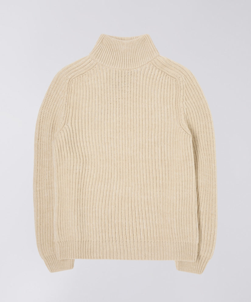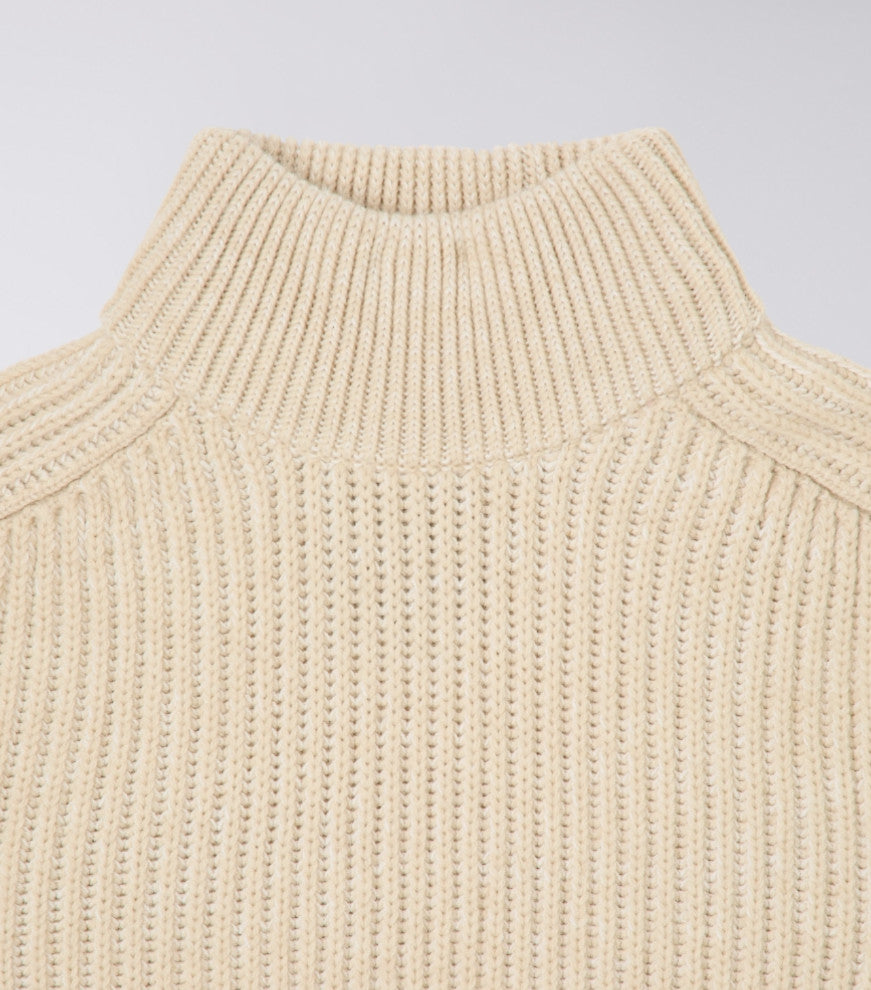 The EDWIN Roni High Collar Sweater is an oversized knit pullover that combines warmth and structure. Crafted from a heavyweight blend of 50% merino wool and 50% acrylic, it features a high collar and fully fashioned cuffs for a clean, high-quality silhouette. Its dense knit construction makes it ideal for winter, and it comes in a beige color that blends comfort with thoughtful design.